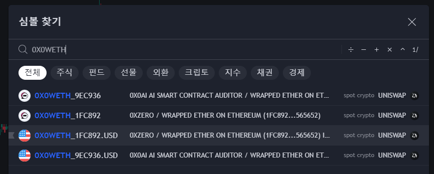 DEX 코인에 대한 차트는 0x0WETH, 0x0WETH.USD 이렇게 티커를 치시면 바로 항목이 뜹니다.