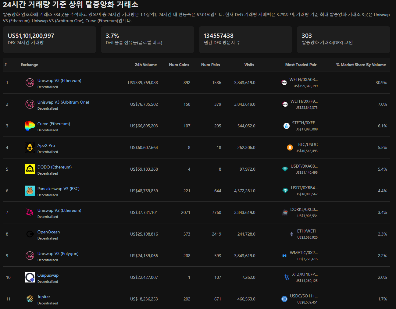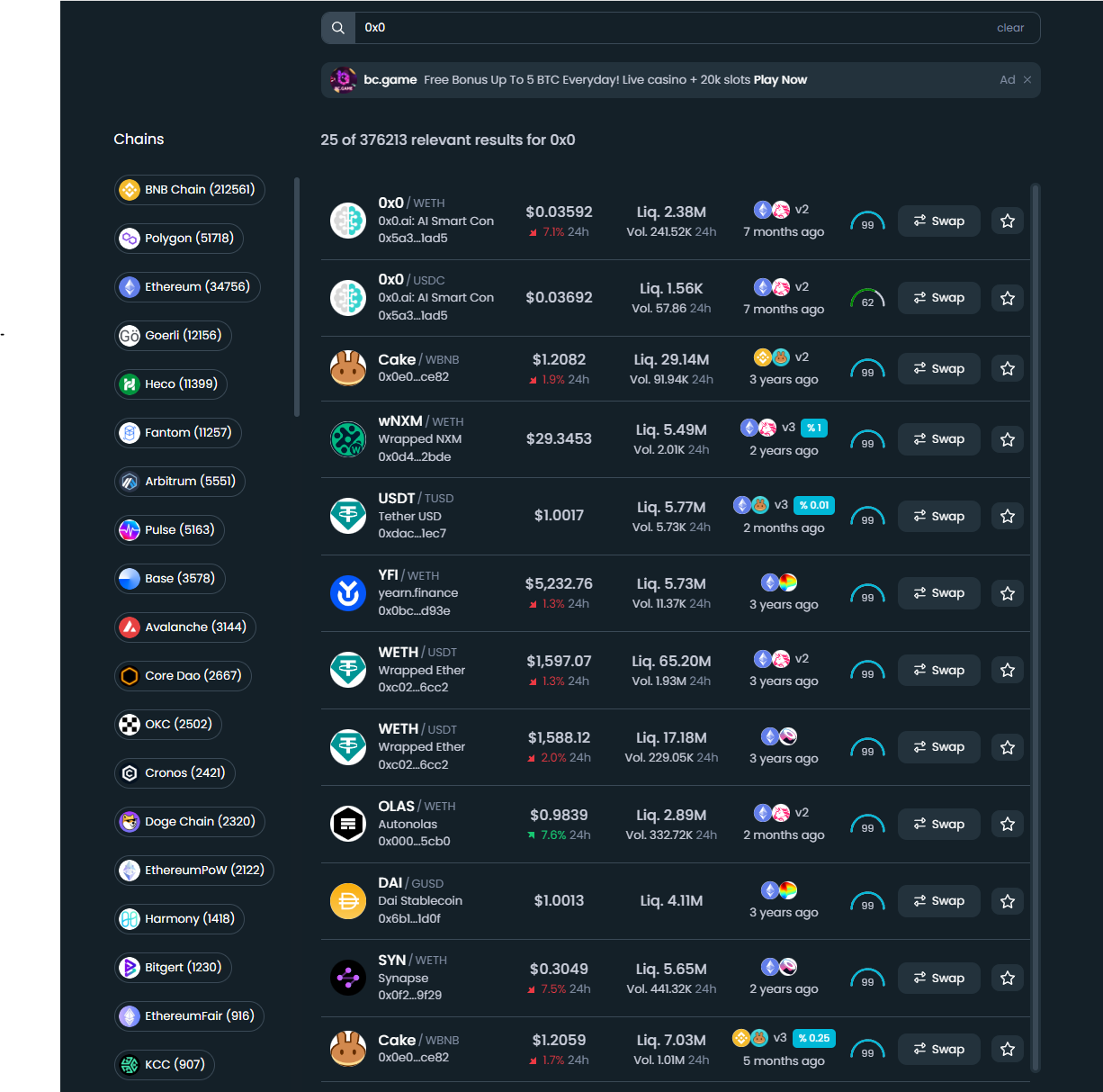 정말... 많은 체인의 DEX 거래소에 상장되어 있는 토큰들을 볼 수 있습니다.