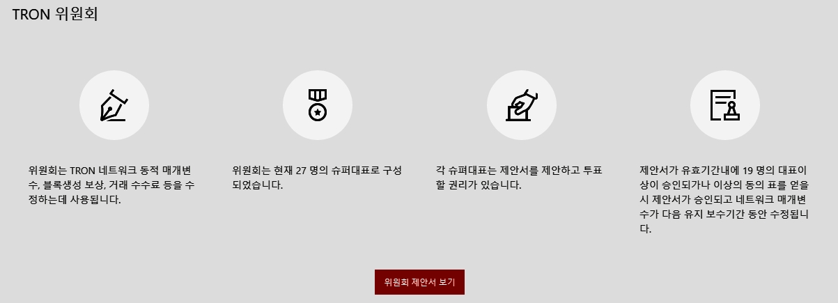 생태계발전을 위해 TRON위원회(TRON COMMITTEE)에서 제안(Proposal)을 내고 27팀의 SR들의 찬반을 통해