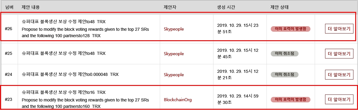 #22 proposal을 보면 2019. 10. 31 PM 09:00 효력이 발생을 했습니다.
