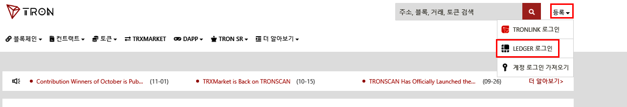 트론스캔 상단 등록을 누르셔서 렛저 로그인 클릭!!